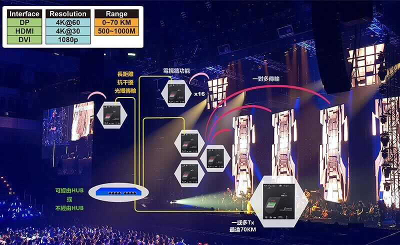 在音樂會或是演唱會的應用裡,通常需要在具有眾多複雜電器設備和吵鬧的環境中做長距離的影音信號傳輸。 有時候,即使是使用能支援100公尺 (例如HDBaseT延長器) 或是其他 CATx 影音延長器在實際環境下也不夠長。