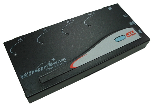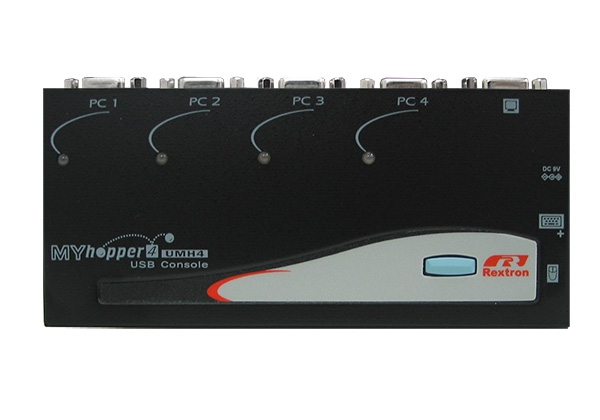 Rextron MYhopper UMH-4, VGA USB KVM電腦切換器, 是一套VGA KVM切換器和USB HID周邊設備分享的4埠多電腦切換系統. 通過一個USB鍵盤, 一個USB滑鼠和1台螢幕輕鬆操控4台電腦, 支援解析度高達 1920x1200.