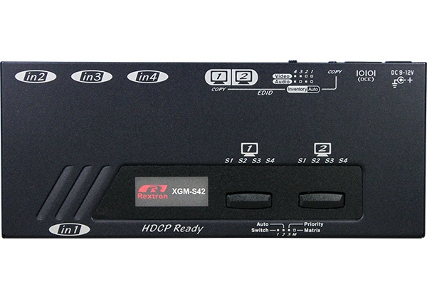 4進2出XGM-S42, HDMI矩陣, 支援紅外IR及序列RS-232控制, 使用者可從4個HDMI 訊號源中任選1個畫面並播放到2個HDMI螢幕/投影機. 智能切換功能自動偵測最新訊號源接入自動播放, 使用者也可設置優先權依序播放. 矩陣模式下系統可同時播放2個不同畫面. 可手動按鍵切換或是用遙控器來選擇想要的頻道.