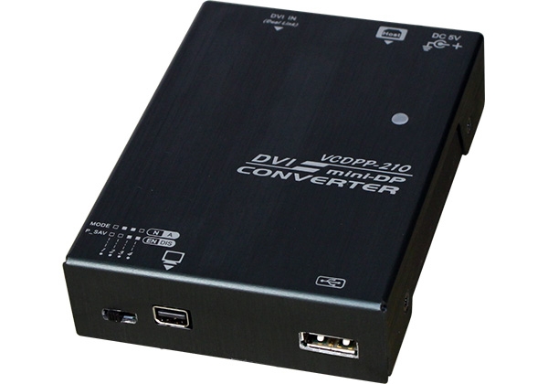 DVI轉Mini DP, VCDPP-210, 影像訊號轉換器支援最高解析度 DVI-DL 2560x1500, EDID自動學習或是針對顯卡手動設置EDID. 特別適用於具Mini DP埠24”~28” LED 高解析螢幕 (2560 x 1440 / 2560 x 1600). 獨特滑動開關設計能針對不同規格GPU到螢幕間傳輸訊號優化, 也同時提供節電功能設置. 免外接電源設計系統可從USB埠取電 (DC5V 600mA) 提供簡潔安裝空間.